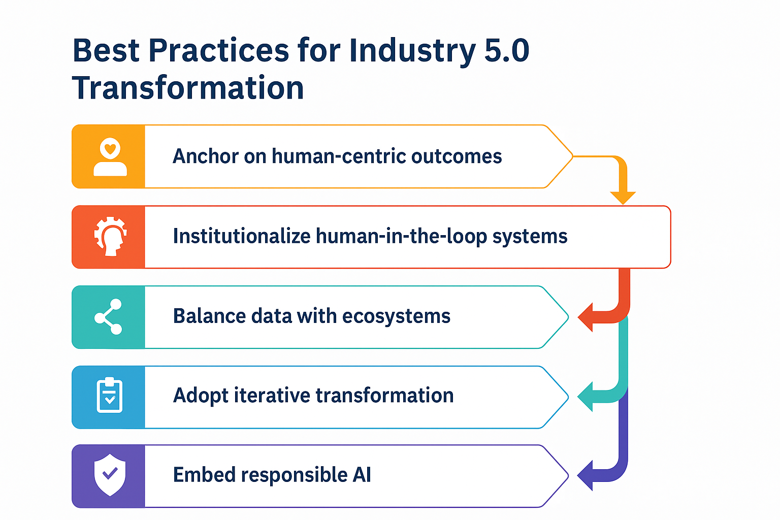 Transitioning to Industry 5.0 is not about technology adoption alone. It requires deliberate choices in governance, culture, and execution. Organizations that succeed share a common playbook: