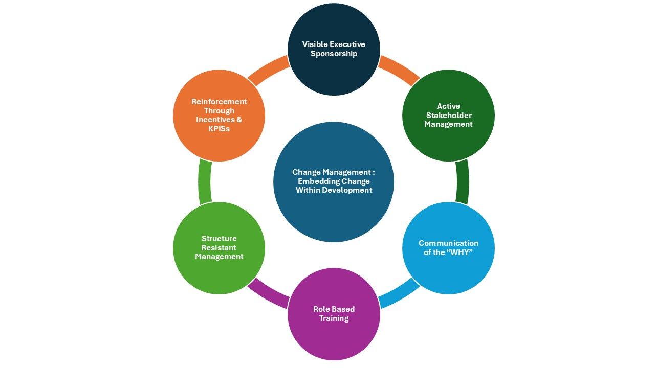 visible executive sponsorship, active stakeholder engagement, clear communication of the “why,” role-based training, structured resistance management, and reinforcement through incentives and KPIs. The essence is integration — embedding change within development, not running it as a parallel stream.